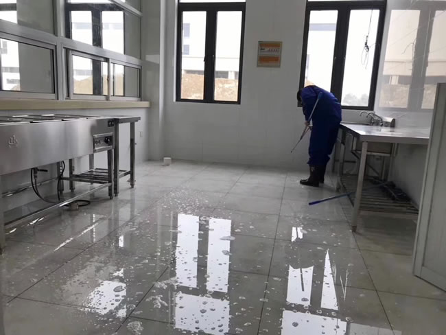2019-3-11蘇州常熟市【百聯自動機械有限公司】新廠房食堂后廚區域地面防滑處理完工,地面遇水油也不再濕滑如溜冰場,預防意外滑倒傷害。