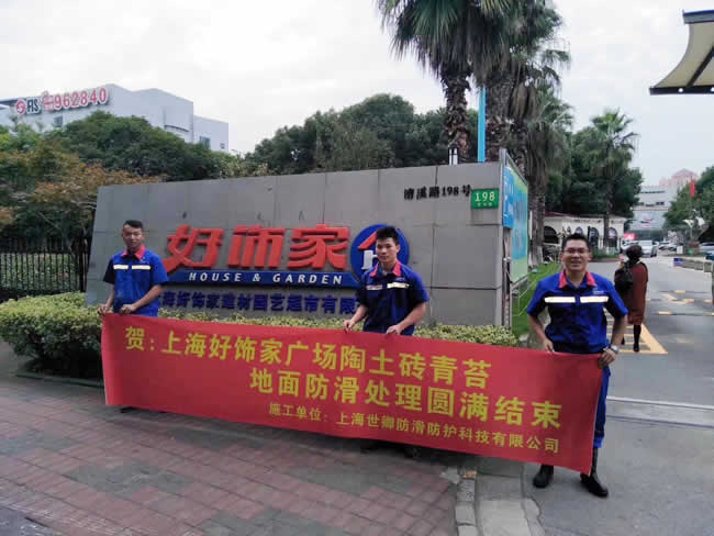 上海好飾家燈具廣場 室外地面防滑處理,歷時四天三夜,于2017年10月23日全部完工。 世卿防滑擁有全面的防滑方案,一流的服務團隊,完善的售后。