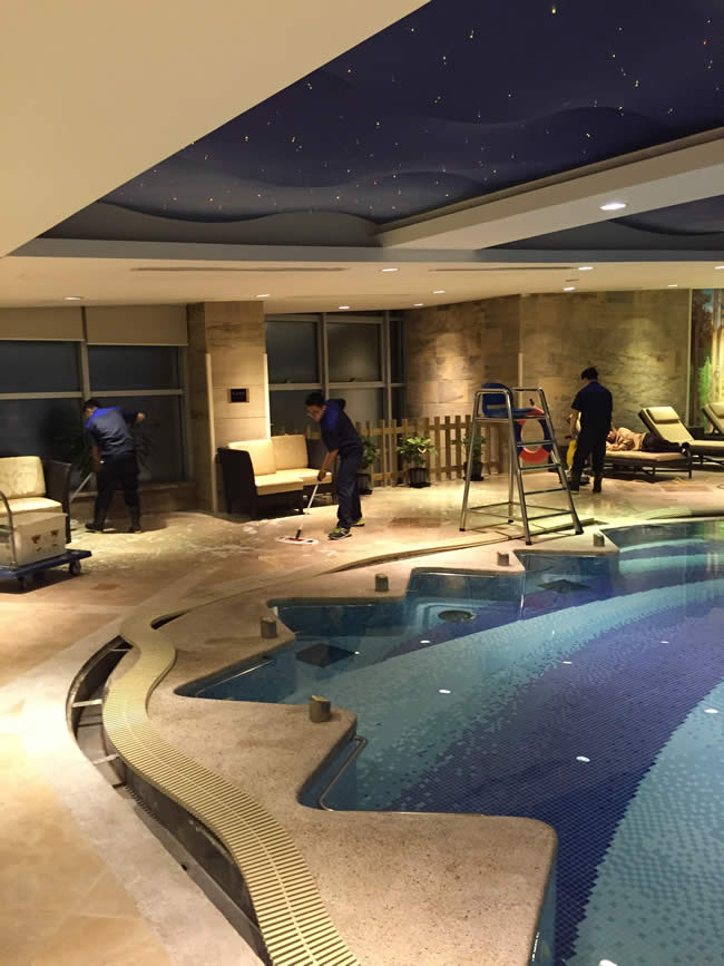 祝賀世卿防滑防護科技有限公司于2015年6月完成舟山嵊泗豐華國際大酒店的地面防滑施工工程。 上海世卿防滑防護科技有限公司專業研發,生產,銷售地面防滑材料,并承接大面積防滑工程,專業施工團隊,為您上門服務!我們堅持秉承創造綠色環保、營造安全健康,創新發展、不斷超越的經營理念以及客戶至上的核心價值觀,一直在努力做對社會有意義的事! 市北高新商務中心坐落于江場三路258號,由上海市北高新(集團)有限公司投資建設。簡約的建筑外表搭配Art Deco的內部裝飾,為您提供一個社交商務、會務宴請、私人聚會、休閑娛樂的商務社交平臺。盡善盡美的個性服務,無微不至的悉心關懷,使市北高新商務中心處處散發著尊貴的氣息。中心近一萬平方米,共分五層,包羅萬象:專業的健身中心為您帶來健康生活理念;頂級餐廳設施包括氣派典雅的中餐廳、高端悠閑的西餐廳、奢華尊貴的紅酒雪茄室、環境優雅的大堂吧、多功能廳及音樂廳,奉獻給您東、西方飲食文化新境界;一應俱全的宴會廳、會議室和影視廳,滿足私人宴會、各類展覽等多樣需求。高端頂級SPA,提供國際化的水療和按摩服務,為您帶來健康生活的享受。上海市北高新商務中心游泳池地面材質為釉面磚,最常見的這種材質的地面一旦遇水非常濕滑,容易造成行人行走滑倒,存在極大的安全隱患,降低了工作人員的工作效率,經過我司的防滑處理,保持著原有的地面原貌,也解決了客戶的地面濕滑問題,得到了上海市北高新商務中心的認可和極高評價。我司專業承接地面防滑處理、瓷磚防滑處理、地磚防滑和大理石防滑處理工程服務,以及銷售地面防滑產品——世卿防滑劑。歡迎致電咨詢:021-20981810。